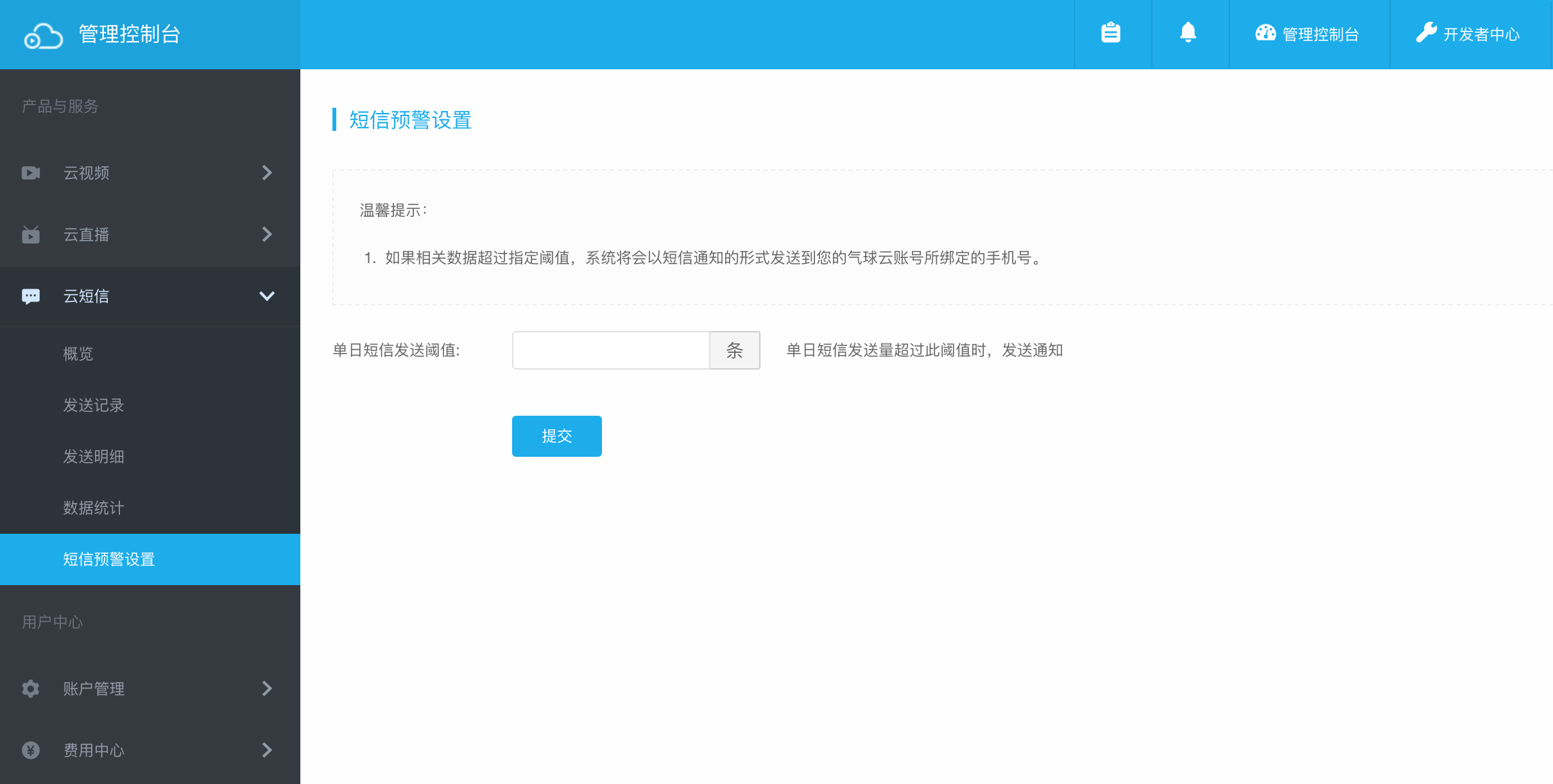 为御防通过恶意软件刷短信,我们提供了短信用量预警设置——您可以在气球云的「管理控制台」->「短信预警设置」中设置「单日短信发送阈值」,当用户的当日的短信发送量超过此阈值时将会,气球云将会发送短信到您的账号所绑定的手机上。如下图: