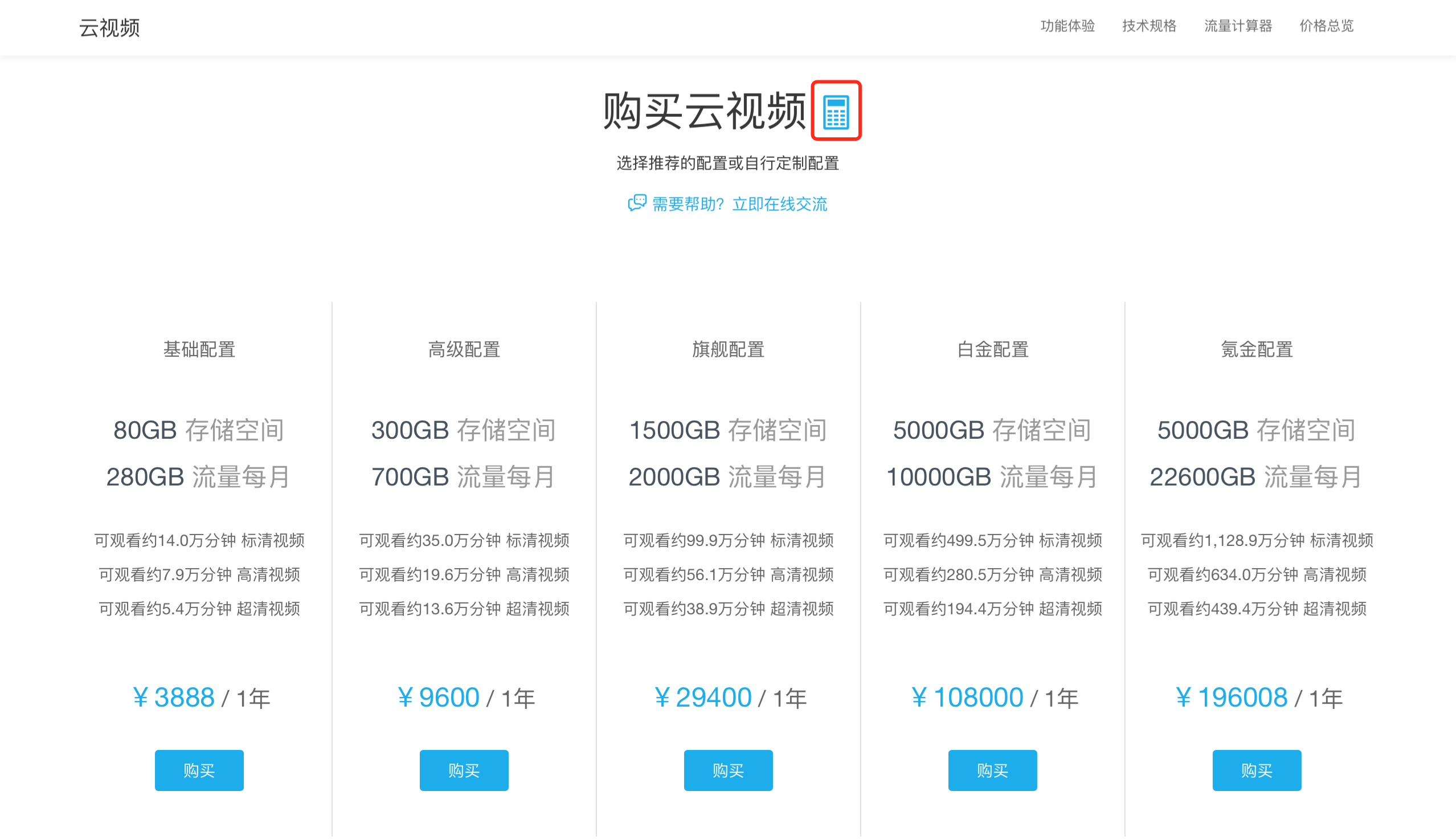 在购买、升级、续费云视频时,同样可以随时调出计算器进行核算,不需要切换页面,方便快捷。如下图: