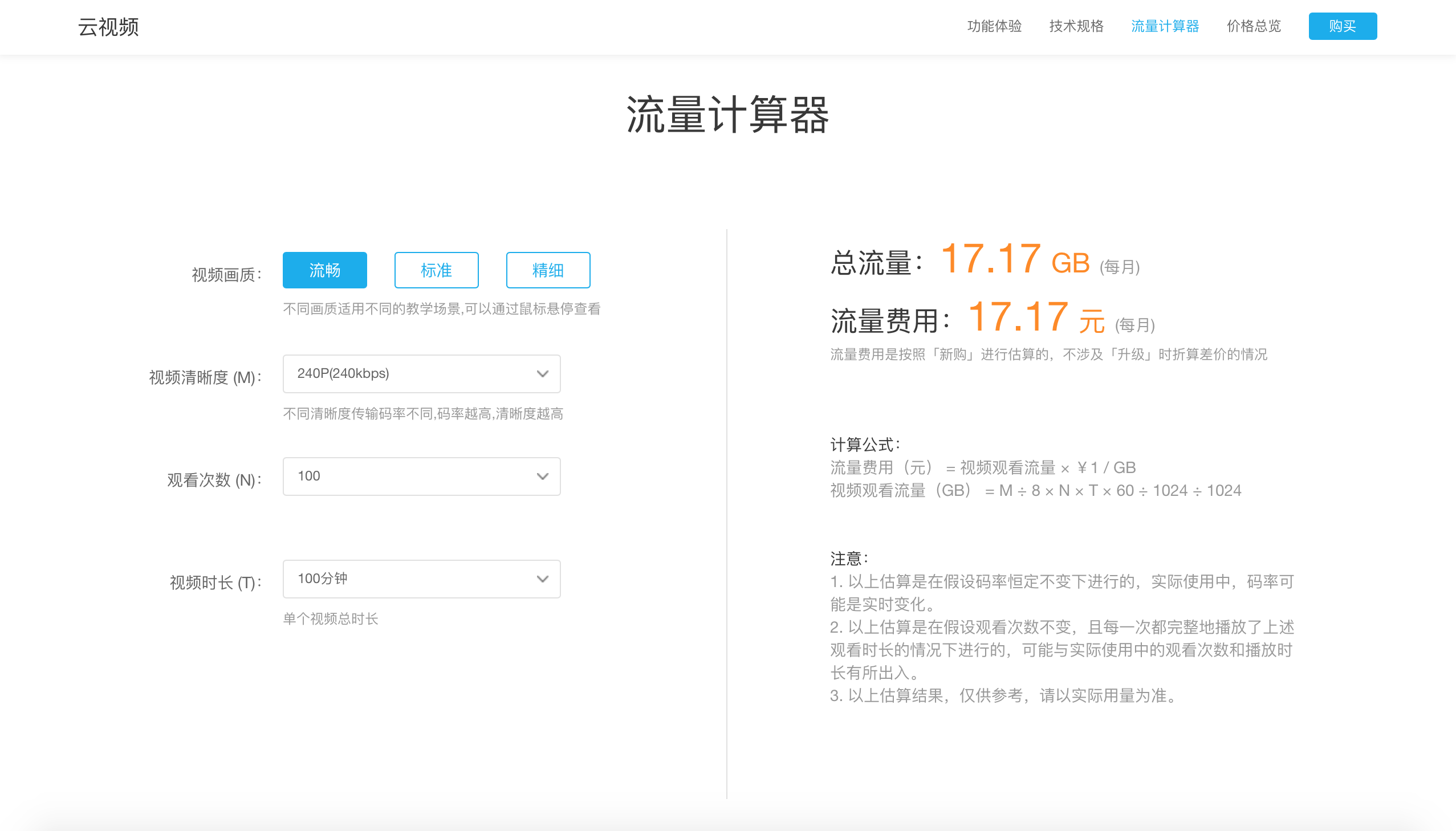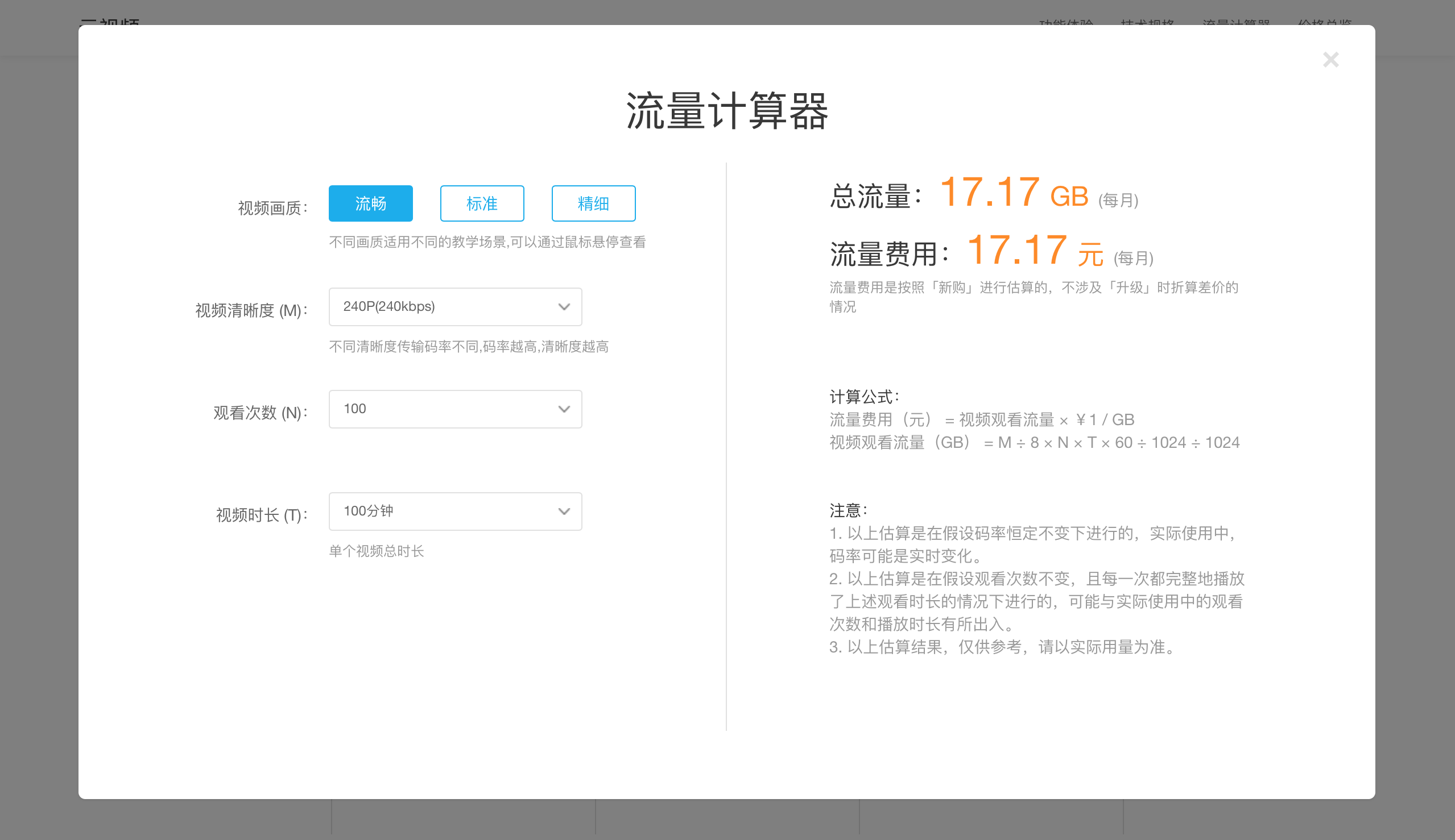 您可以根据自己的实际情况(视频清晰度、单个视频的总时长、观看次数),快速精确核算出合理的视频流量成本,让您购买云视频包时不再迷茫。如下图: